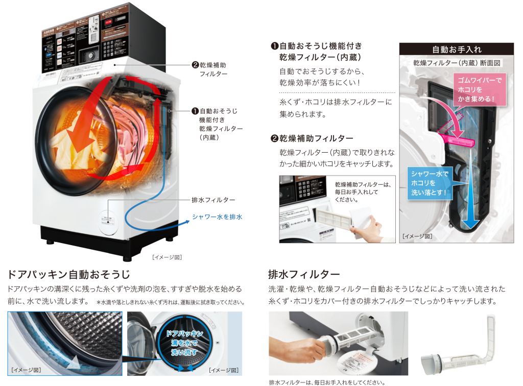 洗濯運転前と乾燥運転中に内蔵乾燥フィルターに溜まった糸くず・ホコリを、シャワー水とゴムワイパーで自動おそうじ。