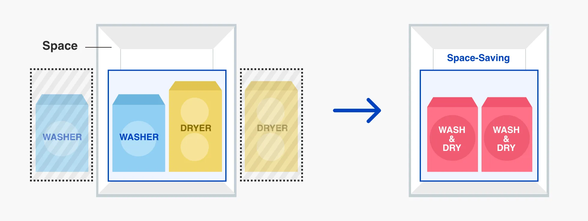 Washer and dryer combos mean less space is needed, as a single machine can handle the functions of a both a washing machine and a dryer. The effective use of limited space is especially important in places like laundromats.