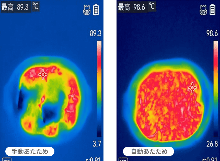 手動あたために比べて自動あたためのほうがムラを抑えて加熱できた。