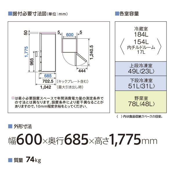 幅600mm×高さ1775mm×奥行685mm※1
