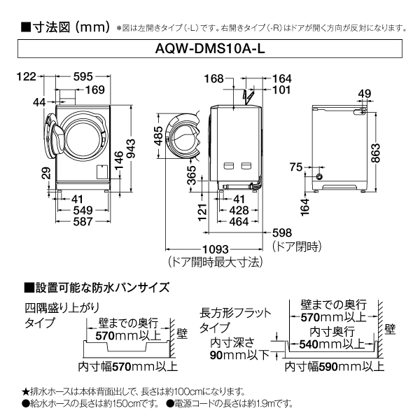 ※1:設置可能な防水パン:内寸幅590mm、内寸奥行540mm、壁までの奥行570mm以上