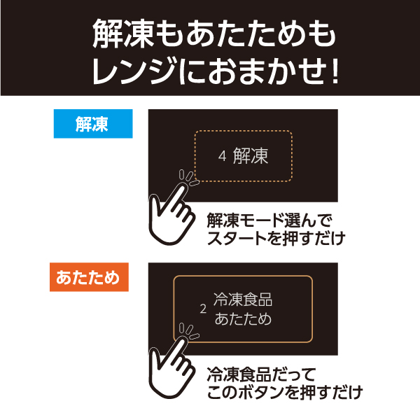 解凍時間・出力の設定不要『冷凍食品あたため』ボタンを押すだけでおいしくあたため。