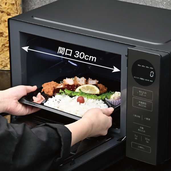 お弁当のあたためも時間・出力の設定なしでボタンを押すだけ、 間口が30㎝あるからおおきなお弁当も楽々入ります