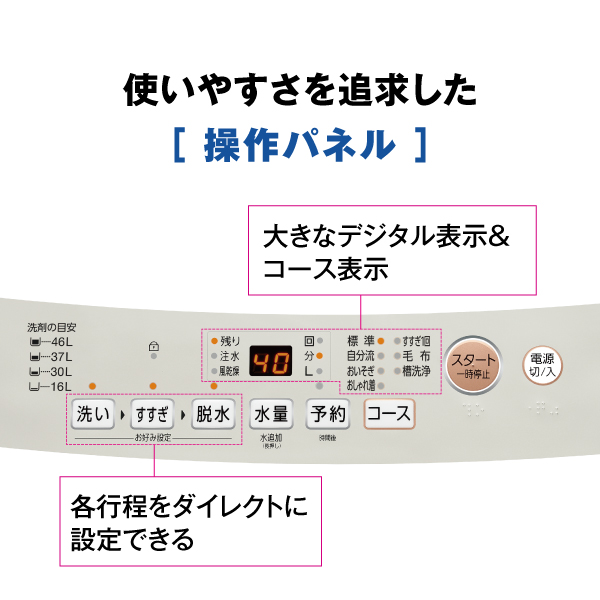 <水量が46Lのとき/水量を手動で 設定した場合/お好みですすぎ・脱水または脱水のみを設定した場合>