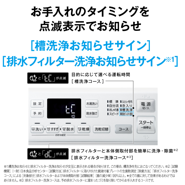 ※3:[試験機関](一財)日本食品分析センター [試験方法] 菌液付着試験布の生菌数測定 [除菌方法]加熱高温水による [対象部分]ドラム内の衣類 [試験結果](菌の 減少率)99%以上*全ての菌に対して効果があるわけではありません。
