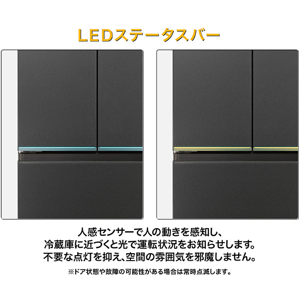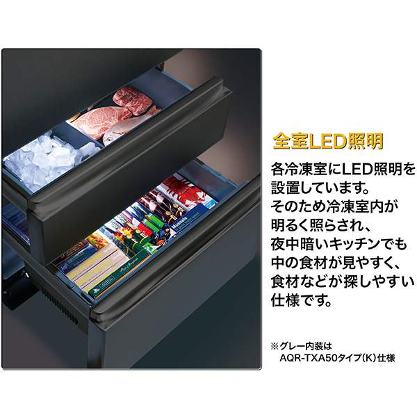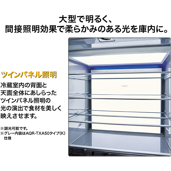 美しいグレー内装と、冷蔵室天面と背面のツインパネル照明で食材を美しく、使い忘れを抑制します。
