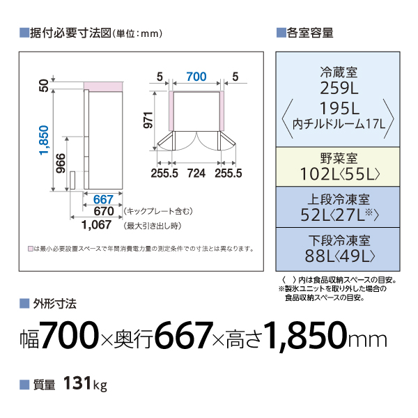 ※1:製氷ユニットを取り外した場合(自動製氷機を使わない場合)は製氷ユニットを外して収納スペースとして使えます。