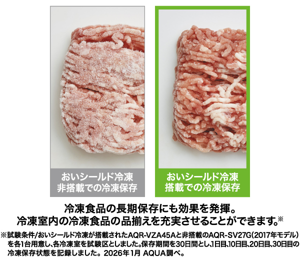 大容量でまとめ買い安心でき、Wの力でおいしく長期保存『大容量冷凍室&全室フォースター&おいシールド冷凍』