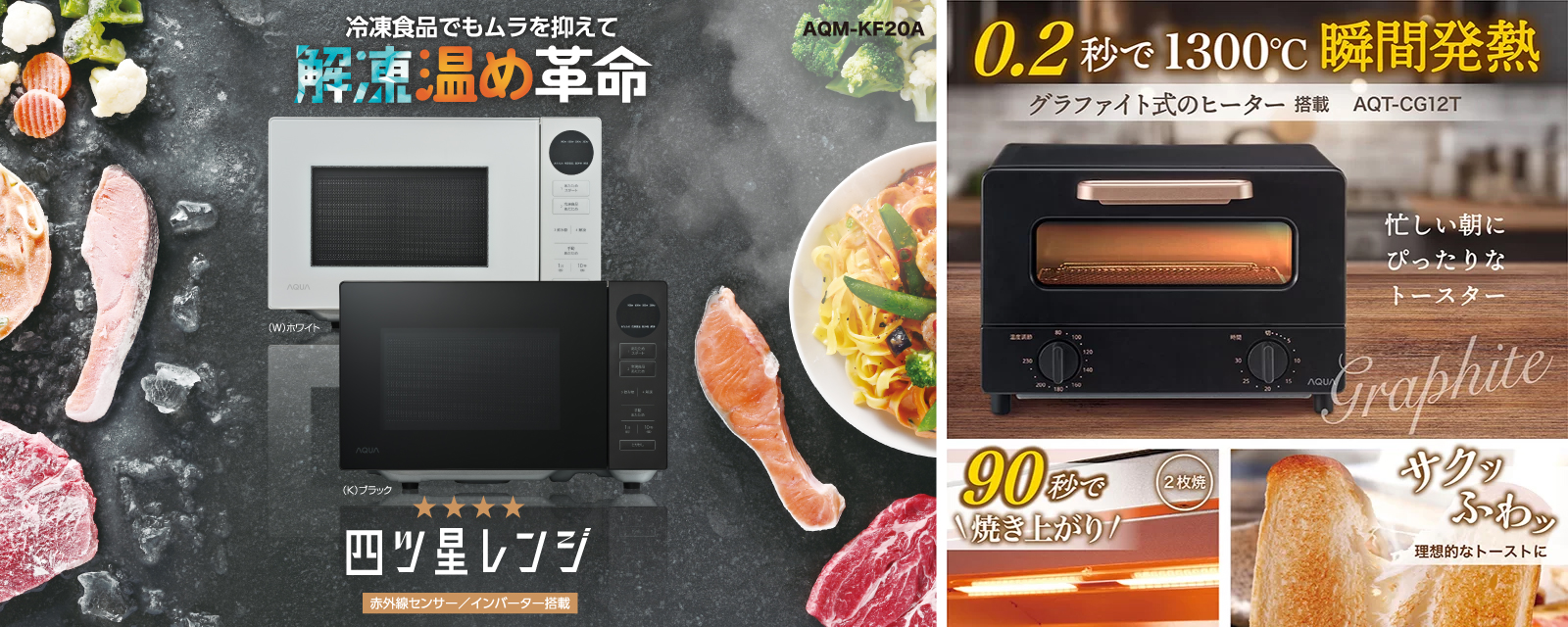 AQUA独自の解凍プログラム「四ツ星解凍」を搭載した電子レンジ、おかずやおつまみ作りなど、幅広く使えるマルチトースター、毎日の調理の手間や時間を短縮できる調理家電を取り揃えています。